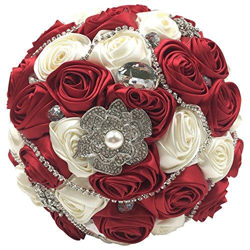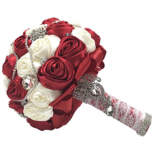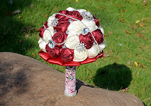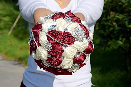 Abbie Home Silk Bridal Bouquet With Crystal Rhinestones Ivory Grey Rose Wedding Holding Flowers (Burgundy)