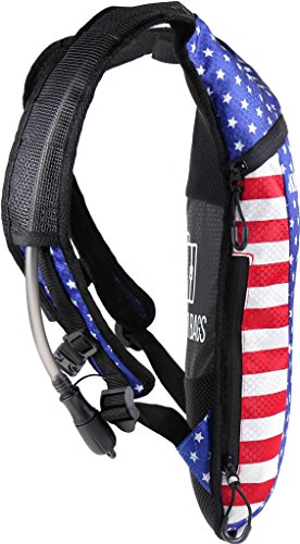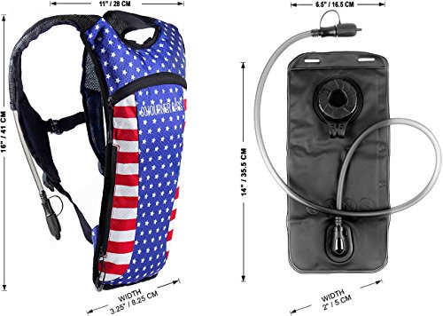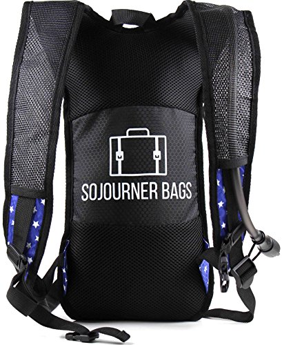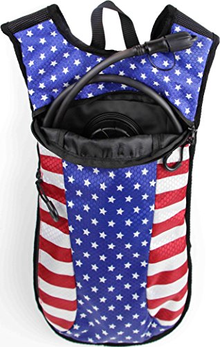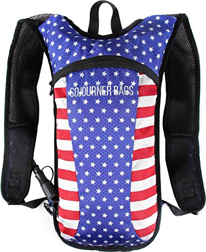 SoJourner Hydration Pack Backpack - 2L Water Bladder included for festivals, raves, hiking, biking, climbing, running and more (USA - American flag)