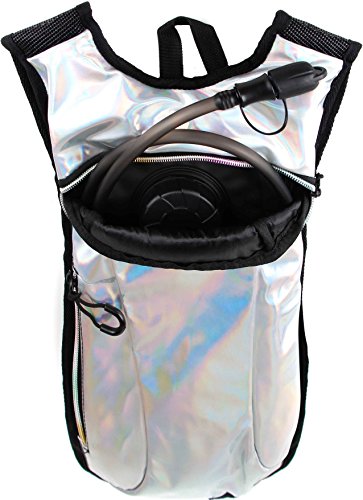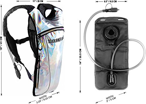 SoJourner Hydration Pack Backpack - 2L Water Bladder included for festivals, raves, hiking, biking, climbing, running and more (Holographic Silver)