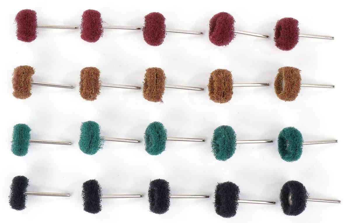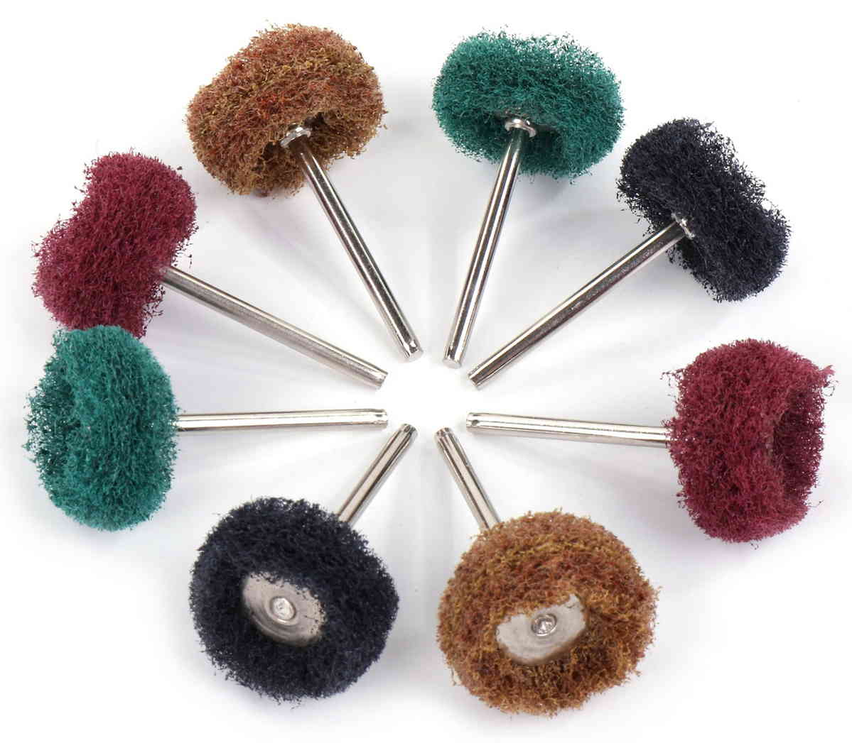 T型のナイロン繊維のバフ、粒度4種類のセットです。3mm軸でリューター、電動ドリルに装着し、研磨、汚れさび落とし等にお使いいただけます。