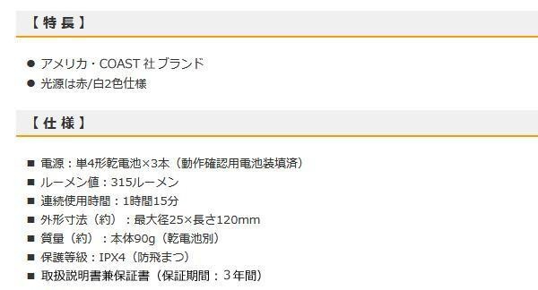 fk094igrjs赤と白2色の光源を搭載したLED懐中ライトですサイズ個装サイズ:14×21×4cm重量個装重量:110g製造国中国アメリカ・コースト社のLEDトーチライト赤と白2色の光源を搭載したLED懐中ライトです