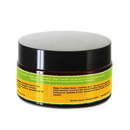 Skin lightening cream from Turmeric Farm: Apply in morning and evening to darker areas of face and body to lighten and balance complexion. Turmeric, a traditional skin lightener, combines with soothing calendula to correct uneven skin tone. Areas of excessive pigmentation are balanced creating a smooth, radiant appearance. Sandalwood and orange work to even and lend light to skin, resulting in a soft, glowing complexion. All herbs are 100% certified organic and extracted using innovative technology.Feature