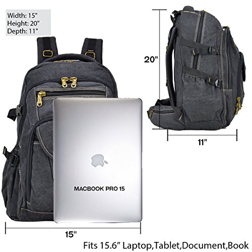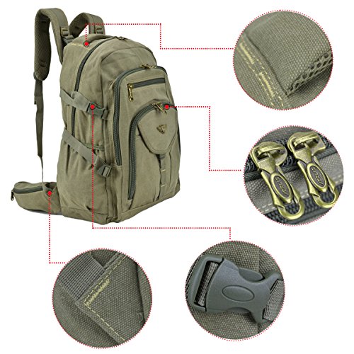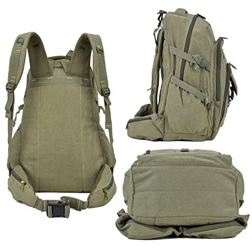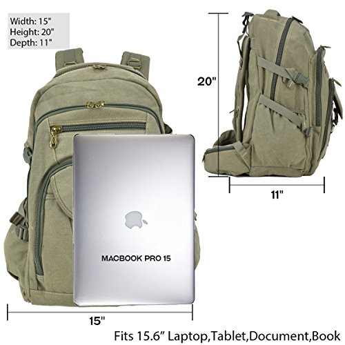 -. Feature : DURABLE AND QUALITY MATERIAL: This large outdoor backpack is made from 100% premium quality High density durable canvas fabric (100% cotton). This travel daypack have heavy duty zippers and vintage brass hardware accents -- No plastic. Stitching is well done and hidden -- sturdy and elegant. It's a must have outdoor equipment. / 50L LARGE CAPACITY AND FUNCTIONAL: Approx. Size -- 15"W x 20"H x 11"D. Approx Capacity: 50L. This outdoor daypack could fit 15.6 inch laptop. It's great for any outdoor activities. Enjoy recreations like fishing, hunting and camping. Can also carry paraphernalia for military, tactical, survival or shooting range training. Athletes can also use it as a sports bag to bring soccer gear or basketball. / 3 COMPARTMENTS W/ MULTIPOCKETS: Well organized. 1- Spacious main compartment with top zipper closure offers plenty of space to hold numerous things like books, tablet, camera, jacket, or other important belongings for all day use for each trip. 2- Middle/ Secondary compartment has interior back wall zip pocket and multitude of accessory pockets. 3- Front compartment and additional flap over snap closure pouch space for extra storage. There are two exterior side panel open top pouch pockets. / COMFORTABLE AND SECURE: This travel backpack for men, women is very comfortable and secure. It has Top padded handle on main compartment for easy carry or lift. Adjustable and padded comfortable shoulder straps to fit most statures. Plus a padded back panel. Each compartment has heavy duty top zippers and bottom cinch straps with extra zipper pouches on both ends to secure sleeping pad or jackets. / MULTIPURPOSE BACKPACKS: Wide applications, it can be used as a hiking backpack, travel bag, voyage bag, outdoor daypack and backpack, camping backpack, school backpack, trip rucksack. We provide excellent customer service, 100% NO RISK Money Back Guarantee, and great protective package. You can't go wrong with it.