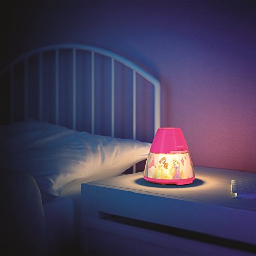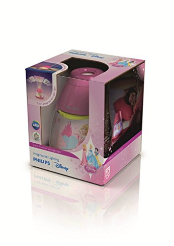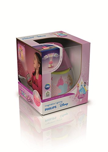 This Philips and Disney Princess night light and image projector will amaze your child with magical story telling. Turn 1 of the film wheels to project fun Princess scenes onto the ceiling or switch on the reassuring night light below. In your child's room, create an environment which encourages them to indulge in what they enjoy most - fun and creativity! A place where your child can study, play and sleep accompanied by their favorite Disney character. It combines a night light with a magical image projector. The night light makes your child feel safe at night, while the projector brings your child's favorite Disney characters to life on the wall or ceiling - comes with 3 wheels, each consisting of 8 different images to stimulate your child's imagination. This unique 2-in-1 light brings bedtime routines and story telling to a higher level. With the two-way switch integrated on the fixture, you can easily switch between a night light and a magical image projector. Three AA batteries are required for operation.Feature