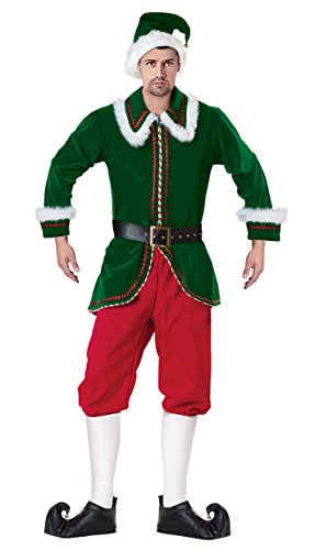 -. Brand : Killreal -. Department : mens -. Feature : Please check our size chart details in Product Description / Green Flocked velvet jacket with faux fur and red metallic accents / Includes: a green jacket, a red trousers, a black waist belt, christmas hat and shoe covers / White knee-high stockings not included / Sell Only by Zp Fashion -. Model : ZP0001258 -. ProductGroup : Apparel -. ProductTypeName : ADULT_COSTUME -. Title : Killreal Men's Deluxe Elf Christmas Costume