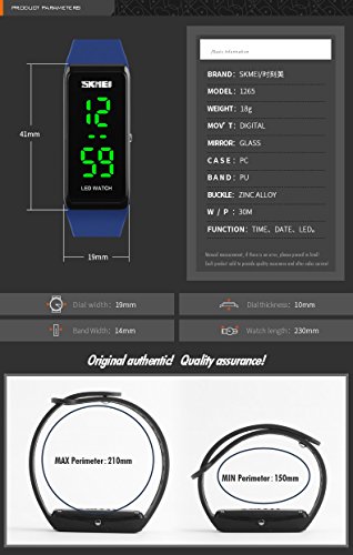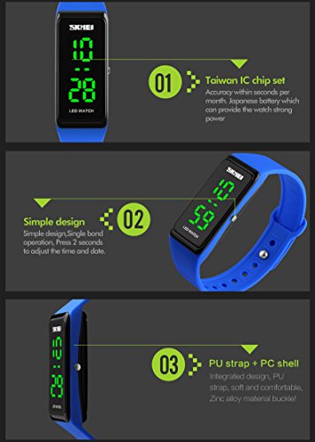 -. Feature : Unisex Sports Silicone Bracelet Wrist Watch, Suitable for Both Women and Men, Girls and Boys, Perfect Choice for Your Family and also Serve as a Festal or Christmas Gift / Ultra Thin Silicone Watch Strap Provides Comfortable Wearing Experience; Delicate LED Digital Clear Screen Ensures Easily Reading Time and Date; Single Setting Button Ensures Simple Operation / Hour, Minute, Second, Month and Day Clear Display and It's Easy to Switch Lights Mode and Standby Energy Saving Mode. / Excellent IC Chip Ensures the Accuracy of the Time and Long Service Life; the Skid Proof and Wearable High Hardness Glass Screen; Single Setting Button and You can Long Press 2 Seconds to Cycle Time; Adjustable Silicone Wrist Band and Push in Table Buckle / Water resistant to 30 m (99 ft): In general, withstands splashes or brief immersion in water, but not suitable for swimming.
