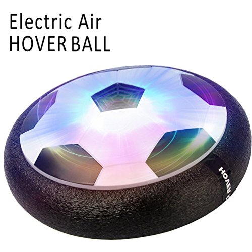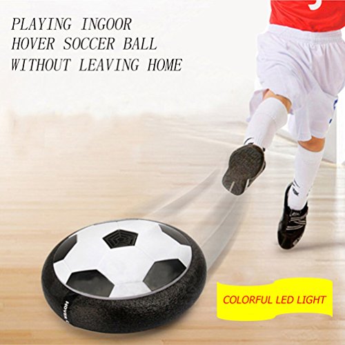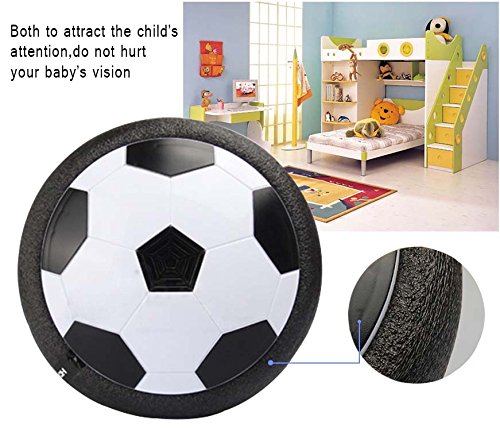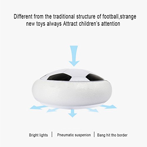 Weight:600g. Size:7.5 X 2 .75 X 7.5in. Note: 1. requires 4 * AA batteries (Not included). 2.like a soccer ball, not a real soccer. 3. The Air power soccer can glide over any smooth of indoor or outdoor surface.