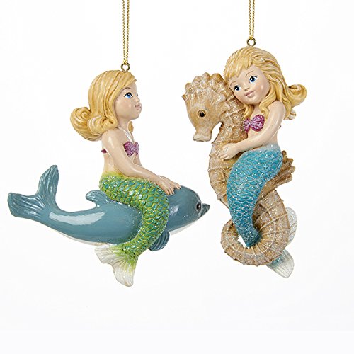 Little Girl Mermaid Riding Seahorse Dolphin Christmas Holiday Ornaments Set of 2