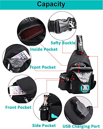 -. Feature : WELL ORGANIZED SLING BAG - Main compartment for iPad Mini, phone, power bank; One Buckle Lock pocket for small notebook; Bulid in zippered pocket for cards, keys; Front pocket for items easily accessible; One side pocket with buckle closure for water bottle and another for umbrella. Weight: 0.45KG; Dimensions: 13x 7x 3.5 inch. / ALWAYS USE THE BEST QUALITY MATERIAL - Selection of wear-resistant nylon fabric and heavy-duty inner lining, durable zippers, adjustable padded shoulder straps. Using environmental luminous powder, in natural light or light irradiation, it will show luminous effect. / USB CHARGING PORT: You can easily and conveniently charge your phone, tablet and other devices without opening up the bag. Put your Power Bank into backpack and connect internal USB cable, then let your charging cable insert external USB port to connect your electronic device. / THE BEST CHOICE - The sling backpack with a variety of young and trendy personality elements. Whether you running, cycling, hiking, climbing or use as a chest bag, shoulder bag, travel bag, daily use bag, this unisex style bag is the best choice, let you stand out in a crowd with our special luminous bag. / QUARANTEE - Quality problems occur within one year replacement, lifetime warranty, if you're not completely satisfied, just CONTACT US and we will give you a 100% refund within 90 days of purchase. It is our intention to offer the BEST customer service on Amazon.