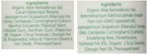 INGREDIENTS: SHAMPOO: Aloe Barbadensis Gel (Aloe Vera), Cocamidopropyl Betaine (Coconut Oil), Propanediol, Decyl Glucoside, Cellulose Gum, Xanthan Gum, Manihot Esculenta (Tapioca) Starch, Palmitoyl Oligopeptide, Palmitoyl Tetrapeptide-7, Glycerin, Polysorbate 20, Niacinamide (Vitamin B3), Biotin, Mel (Honey), Panthenol (Vitamin B5), Galactoarabinan, Oat Amino Protein, Serenoa Serrulata (Palmetto) Fruit Extract, Mica, Flonac Pearl MF-10C, Rosmarinus Officinalis (Rosemary) Leaf Oil, Eucalyptus Globulus Leaf Oil, Argania Spinosa (Argan) Oil, Melaleuca Alternifolia (Tea Tree) Oil, Peppermint Oil, Cehami (Centipeda Cunninghamii), Leptospermum Scoparium Mel (Manuka Honey), Malus Domestica (Apple) Fruit Cell Culture Extract, Lecithin, Gluconolactone, Sodium Benzoate, Phenoxyethanol