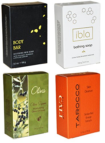 - PACK OF 4 - This pack contains four soap bar variations: EVulcano Body Bar, Ibla Soap, Oliva Green Sapone, and the Tarocco Skin Cleanser. Each bar of soap is 5.3 ounces.