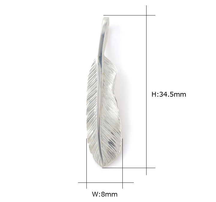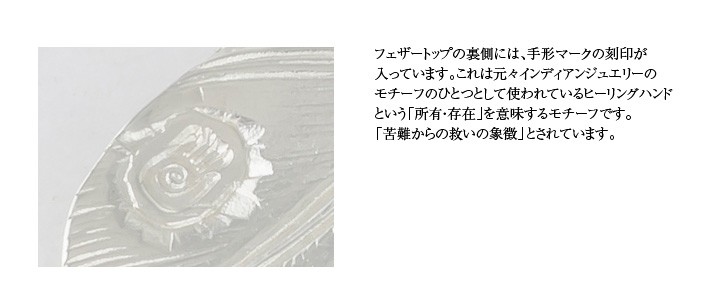 フェザーの表には手形マークの刻印が入っています。 もともとインディアンジュエリーのモチーフとして使われているヒーリングハンドのマークで、 「所有・存在」を意味していると言われています。 このアクセサリーを所有することで「苦難からの救いの象徴」という意味があります。 高さ 34.5mm 横幅 8.0mm
