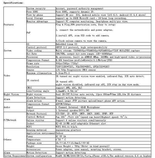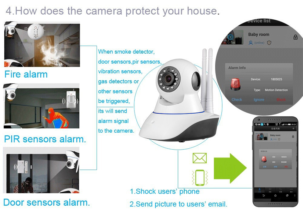 Wifi Camera starts recording a short video and send notifications to your phone when there is motion detection.