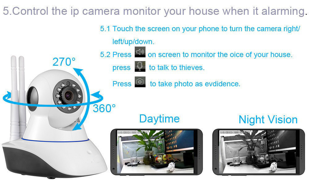 This Wi-Fi HD pan tilt Home IP camera offers extra wide, whole-room surveillance coverage with 270 degree horizontal pan (left and right) and 80 degree vertical tilt (up and down).