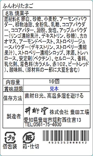 原材料:卵白、砂糖、小麦粉、アーモンドパウダー、植物油脂、全粉乳、乳糖、ココアパウダー、ココアバター、澱粉、食塩、アップルパウダー(リンゴ濃縮果汁、デキストリン、砂糖)、カカオマス、アーモンドペースト、ストロベリージュースパウダー(デキストリン、ストロベリー濃縮果汁)、ストロベリー濃縮シロップ、洋酒、トレハロース、安定剤(ペクチン)、セルロース、香料、乳化剤、着色料(カラメル、赤102、ビートレッド)、酸味料、(原材料の一部に大豆を含む)