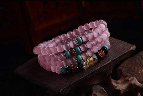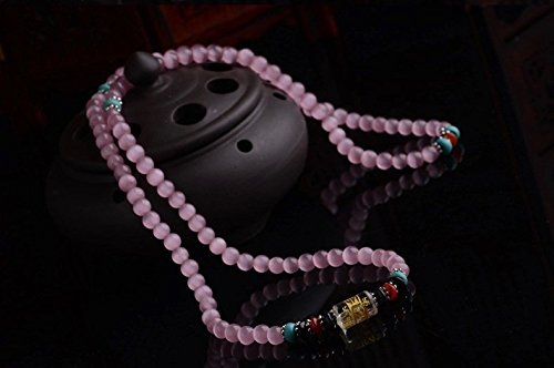 Chris-Wang 1Pcs Womens Buddhist Strand Bracelets Pink Cat's Eye Opal Buddha Meditation Prayer Beads 108-Bead Mala Necklace
