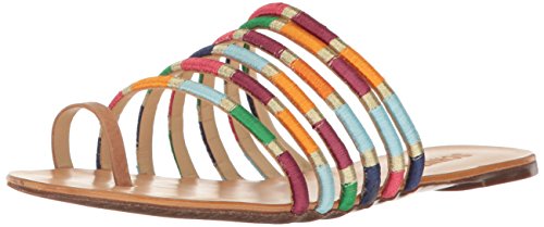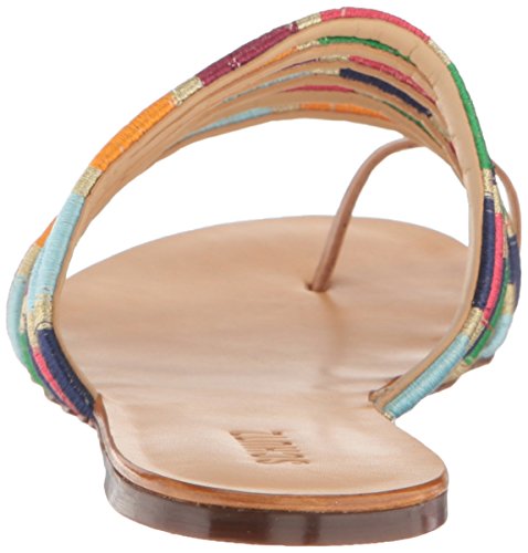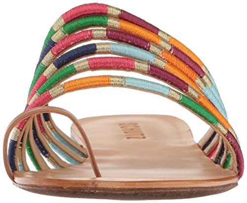 Strappy slide-on sandal featuring toe-ring strap and colorful embroidery