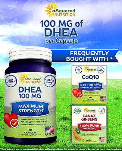 -. Binding : Health and Beauty -. Brand : aSquared Nutrition -. EAN : 0641799787590 -. Feature : MAXIMUM STRENGTH DHEA (100 MG PER CAPSULE): DHEA (dehydroepiandrosterone) is a natural hormone that is produced by the adrenal glands. DHEA Levels peak in your late 20s to early 30s. At that point, DHEA levels begin to dramatically decrease. aSquared Nutrition's Max Strength DHEA formula provides 200 capsules of 100mg DHEA per bottle, which can help restore peak DHEA levels by taking as little as 1 capsule per day. Our product is backed by our 100% MONEY BACK GUARANTEE and is made in the USA / FORMULATED FOR SUPERIOR RESULTS: With 100mg of DHEA per Capsule, our formula is designed to help restore optimal DHEA levels. Restoring balanced DHEA hormone levels promotes healthy metabolism & libido, helps maintain & enhance energy levels, supports healthy brain & immune function, and supports balanced mood. Taking DHEA can be effective for men as well as women. * / BEST VALUE AVAILABLE ON AMAZON: Our maximum strength formula is MADE IN THE USA in a GMP compliant facility. Each bottle of our DHEA 100 MG formula contains 200 capsules of 100mg DHEA. For most people, this is a full 200-day supply. At the highest daily dose we still provide a 100-day supply. Most competitive products only provide 25mg or 50mg per capsule. Others only give you 60 capsules each containing 100mg. We provide the best value on Amazon hands down! * / HIGHEST QUALITY - 100% MONEY BACK GUARANTEE: Rest assured that we use the highest quality ingredients and our products go through stringent quality control testing. As always, our products are backed by our 100% Money Back Guarantee. We are confident that you will love our high quality and well thought out formula. However, if you are dissatisfied with the product you have 30 days to return it for a full refund. * / PROVEN TRACK RECORD: aSquared Nutrition prides themselves on quality and reliability. We know you'll love our ever-expanding product line. We have a great selection from CoQ10 400mg (Coenzyme Q10) to Vitamin B-12 (Methyl B12). Newer products include our CLA 1250, Turmeric Curcumin, Organic Ceylon Cinnamon, Omega 3 Fish Oil, Green Coffee Bean Extract, Garcinia Cambogia, Pure Raspberry Ketones, Colon Detox & Cleanse, Prostate Support, Panax Ginseng and Caralluma Fimbriata to name a few. * -. IsAdultProduct : 0 -. Label : aSquared Brands -. LegalDisclaimer : These Statements have not been evaluated by the Food and Drug Administration. This Product is not intended to diagnose, treat, cure or prevent any disease. -. Manufacturer : aSquared Brands -. MPN : aSquaredDHEA -. PackageQuantity : 1 -. PartNumber : aSquaredDHEA -. ProductGroup : Health and Beauty -. ProductTypeName : HEALTH_PERSONAL_CARE -. Publisher : aSquared Brands -. Studio : aSquared Brands -. Title : Pure DHEA (100mg Max Strength, 200 Capsules) to Promote Balanced Hormone Levels for Women & Men - Natural DHEA Supplement Pills to Support Healthy Metabolism, Libio, Brain, Immune Function & Energy -. UPC : 641799787590