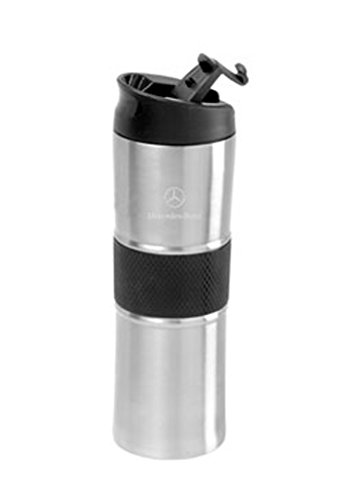 This 16 oz. stainless steel tumbler includes dual wall vacuum insulation for maximum heat retention. A textured rubber center provides a comfortable secure grip. Flip-top lid locks with a snap to prevent drinks from spilling. Mercedes Benz logo on front. This tumbler does not fit in the S-Class Coupe.