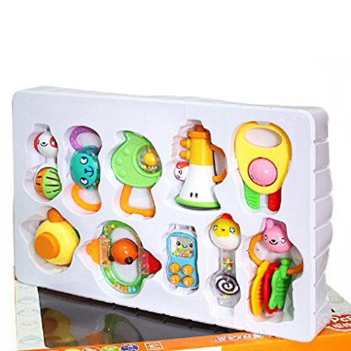 10 piece Baby Rattle Toy Set includes a variety of unique and interesting rattle figures so little baby can be entertained and play. Baby is eager to see every rattle what it could do and how it will react. Comes in large package and sturdy quality. Perfect baby gift toy.