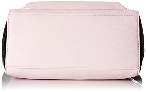 Color-block bag featuring twin top handles with heart-shape grommets and exterior pocket with decorative bow