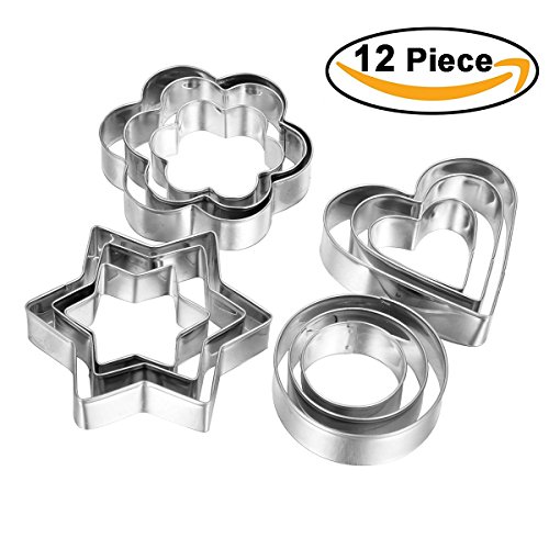12Pcs Metal Cookie Cutter Set Stainless Steel Molds, Stars, Flowers, Round, Hearts Shape, Assorted Sizes