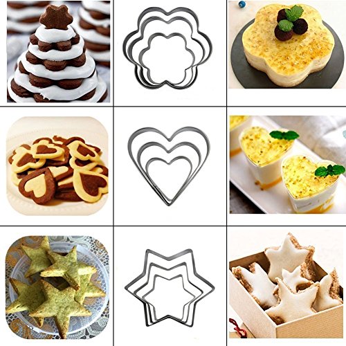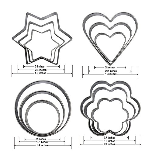 - Different Shapes: Shapes Cookie Cutters Set includes 3 sizes of 4 different shapes, 3pcs star shape,3pcs flower shape,3pcs circle shape,3pcs heart shape.