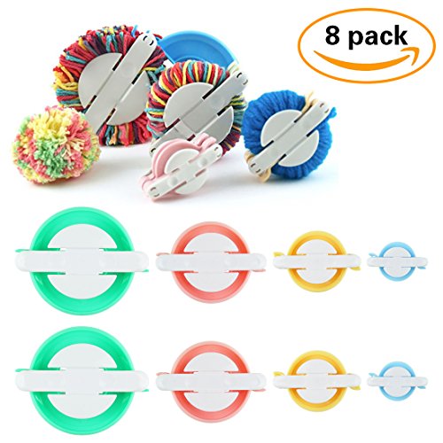 - QUANTITY: Packages comes with 8 makers, 2 yellow(1.4"), 2 blue(1.8"), 2 pink(2.5"), and 2 green(3.4"), enough for your making pom poms. NOTE: THE ITEMS ARE PACKAGED BY OPP BAG!