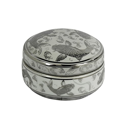 Benzara Ceramic Koi Design Covered Box Decorative, Silver/White