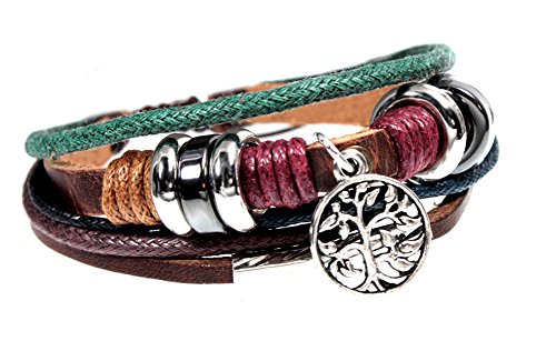 Five strand leather zen bracelet has stylish beads and a silvertone Tree of Life dangle drop. This easy to wear bracelet has pull cords and a center slide knot. Opens from 5.5 to 8 inches. Cord ends are embellished with silvertone nuggets. And it arrives in a foil linen gift box ready to give or to send directly to the recipient.