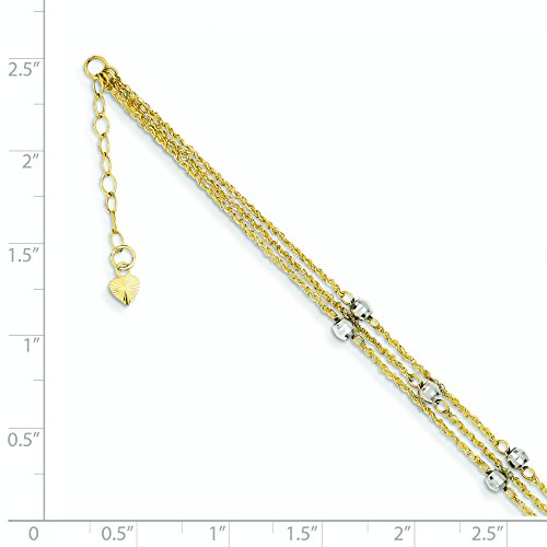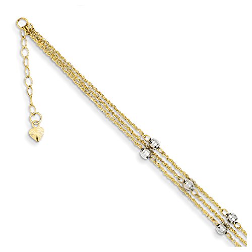 SPECIFICATIONS: Jewelry Type: Anklets, Anklet Type: Anklets with Stations, Material: Primary: Gold, Material: Primary - Color: Two-Tone, Material: Primary - Purity: 14K, Finish: Polished, Chain Length: 9 in, Chain Width: 6mm, Clasp /Connector: Spring Ring, Extender Length: 1 in, Feature(1): Adjustable, Texture: Diamond-cut, Feature(2): Multi-Strands
