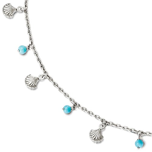 Anklets are a great way to add fun, flash and a feminine touch. This adjustable 9 to 10-inch ankle bracelet is crafted from polished sterling silver and genuine turquoise beads. It features five 7mm fan shaped sea shelled and six 4mm turquoise beads dangling on a 2mm width cable chain that is finished with a fancy lobster clasp. Color range varies on all natural stones so please allow for slight variations in shades. Gemstone treatment: ImpregnationFeature