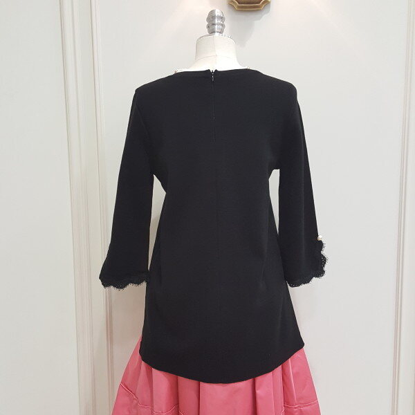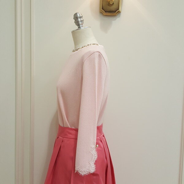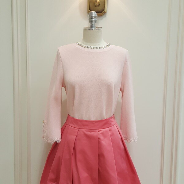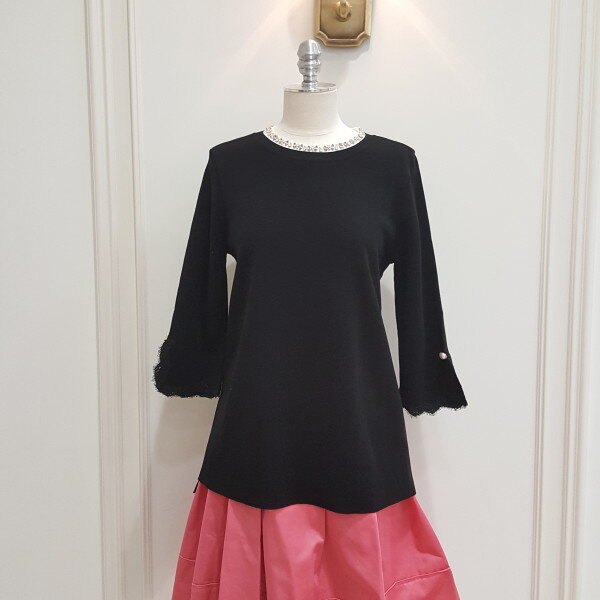 체형커버가 용이한 실루엣과 기장의 플오버.소매의 디테일이 여성스러우며 네크의 비딩장식이 포인트