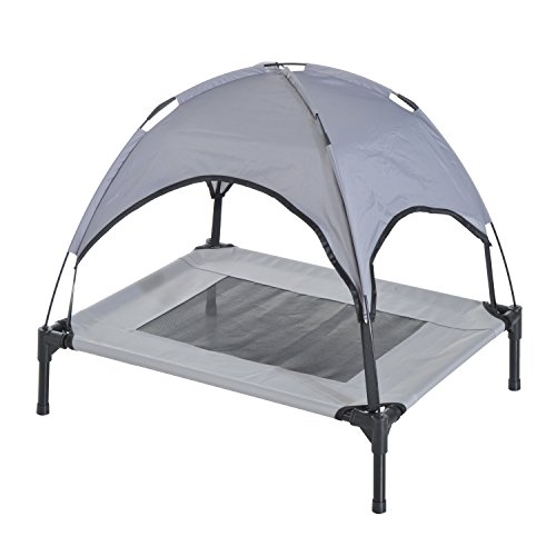 -. Binding : Misc. -. Brand : Pawhut -. Color : Grey -. Feature : ✔ ELEVATED AIRFLOW: An elevated, cot-style design lifts your pet more than 7 inches off of the ground which allows air to flow freely on all sides and underneath. / ✔ BREATHABLE FABRIC: The bed's durable mesh fabric adds breathability to help keep your pet cool, which is especially important during those hot summer months. / ✔ DURABLE DESIGN: The mesh fabric is held tightly in place by a lightweight yet strong powder-coated steel frame with four stable feet that ensure safe and level placement that won't tip over. / ✔ CANOPY TOP: An included canopy top provides shade to your pet and shields them from the sun on hot summer days. A simple design means all you have to do is plug the canopy into the corners of the cot and secure it with the bungee cords. / ✔ PORTABLE STYLE: With a lightweight, portable folding design and included travel bag for simple storage, it's easy to take our cot with you anywhere you go. -. Label : Pawhut -. Manufacturer : Pawhut -. PackageQuantity : 1 -. ProductGroup : Pet Products -. ProductTypeName : PET_SUPPLIES -. Publisher : Pawhut -. Studio : Pawhut -. Title : Pawhut Elevated Cooling Dog Bed Cot w/ Canopy Shade - Gray