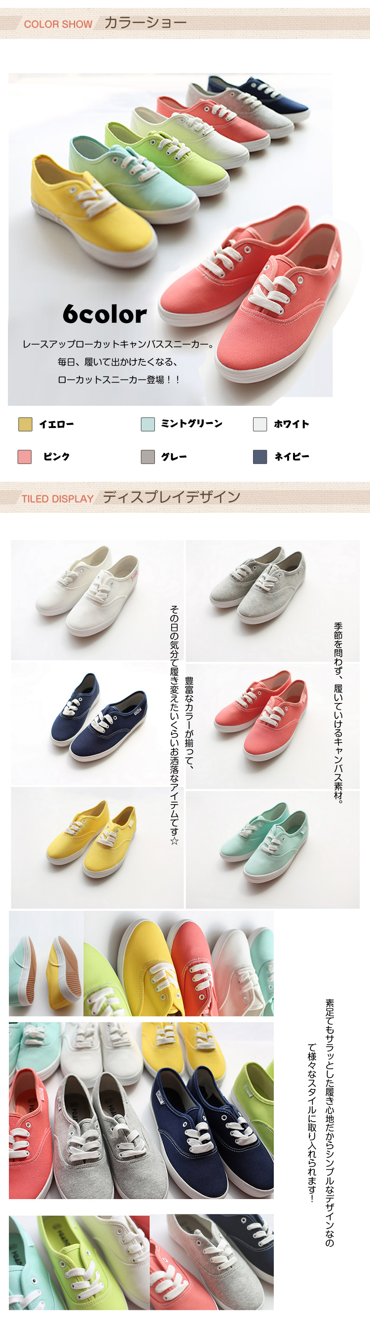 | レースアップローカットキャンバススニーカー。毎日、履いて出かけたくなる、ローカットスニーカー登場!!季節を問わず、履いていけるキャンバス素材。素足でもサラッとした履き心地だからシンプルなデザインなので様々なスタイルに取り入れられます!豊富なカラーが揃って、その日の気分で履き変えたいくらいお洒落なアイテムです☆ | |