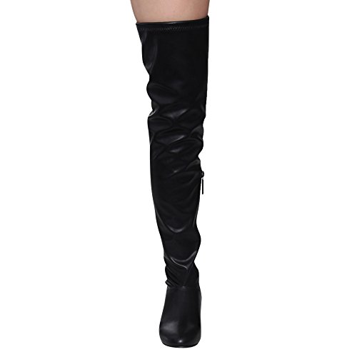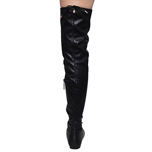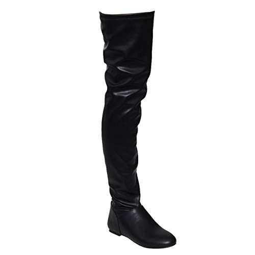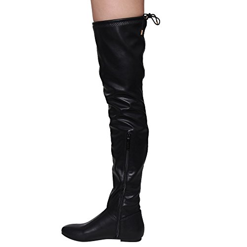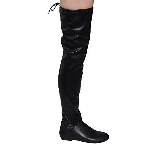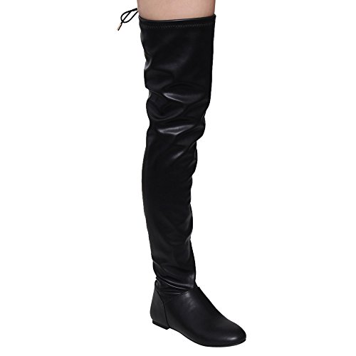 Product Description These boots are refined and classic, they are sure to take your style to new heights! Designed with faux leather upper, thigh high design, drawstring ties at the top of the shaft, and a low flat heel. 0