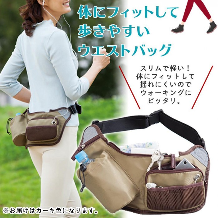 | スリムで軽い!体にフィットして揺れにくいので、ウォーキングにピッタリのウエストバッグ。片手でサッと取り出せる斜め構造のペットボトルホルダー、小銭が入れられるコインポケット、イヤホンホール付きの携帯電話ポケット、鍵の収納ができるキーフックなど、持ち歩きに必要な物がスッキリ収められます。体に接する裏面は全面メッシュ素材でムレにくい!手ぶらが嬉しい旅行時や犬のお散歩時、コンサート時にも。 |