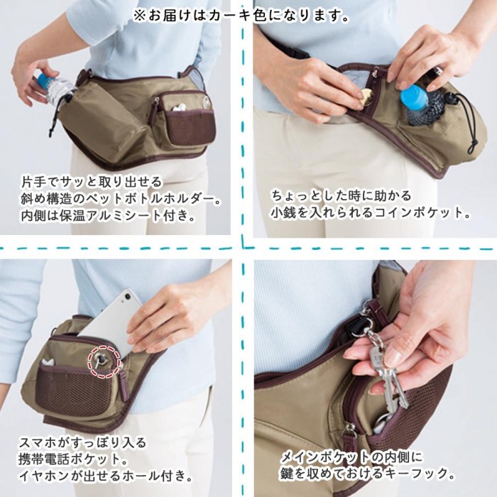 | スリムで軽い!体にフィットして揺れにくいウエストバッグ。片手でサッと取り出せる斜め構造のペットボトルホルダーは、内側に保温アルミシート付き。小銭が入れられるコインポケット、イヤホンが出せるホール付きの携帯電話ポケット、メインポケットの内側に鍵を収めておけるキーフック付き。手ぶらが嬉しい旅行時や犬のお散歩時、コンサート時にも!/ウォーキングバッグ/ウォークバッグ/ウォーキングポーチ/ウエストバッグ/ウエストポーチ/ |