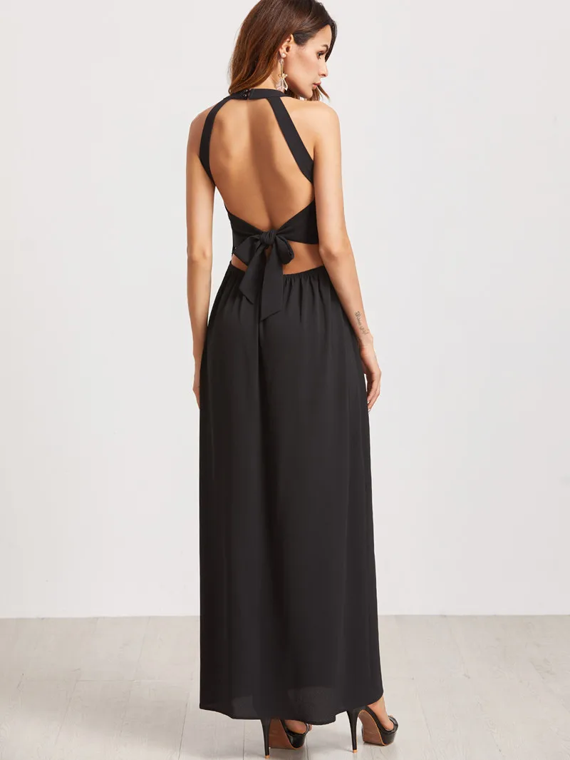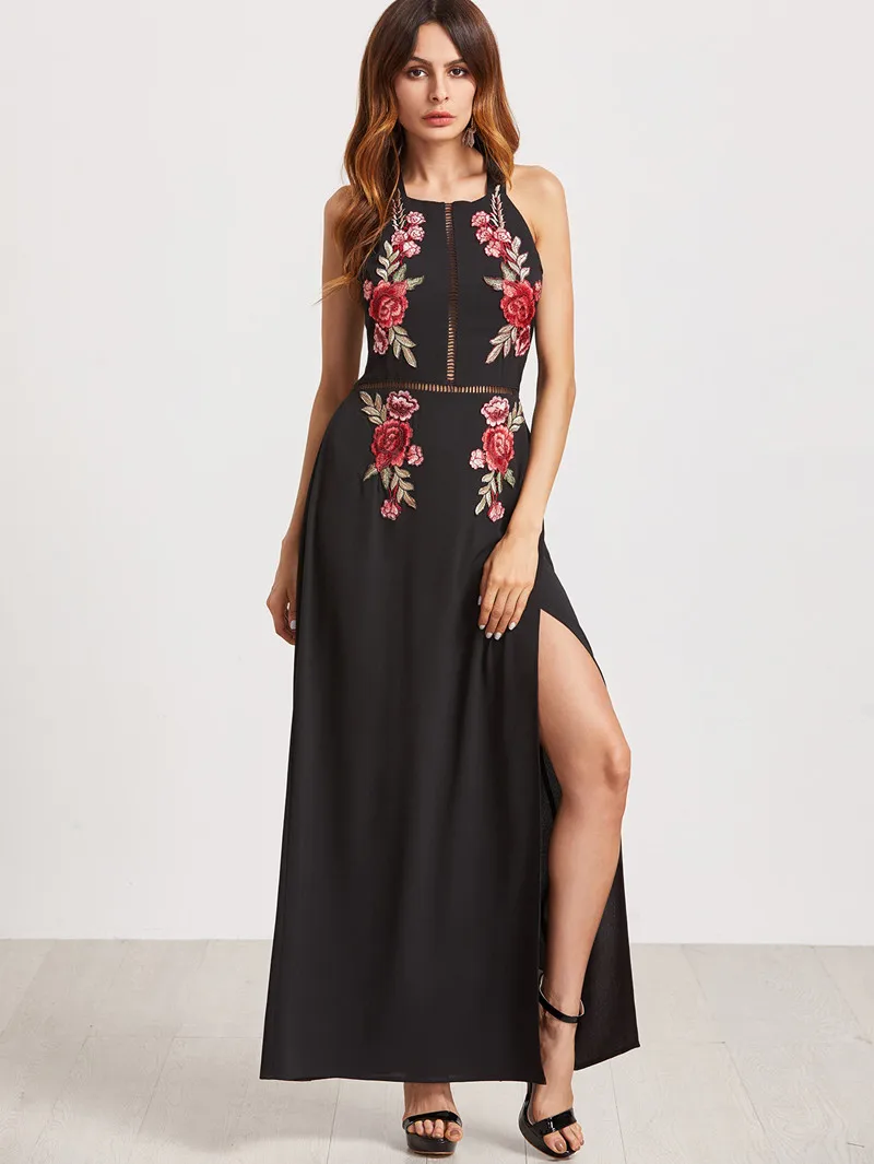 夏の女性のセクシーなシフォンビーチパーティードレス女性ブラックセクシーな背中が大きく開いドレスローズ刺繍包帯マキシドレス新しい到着