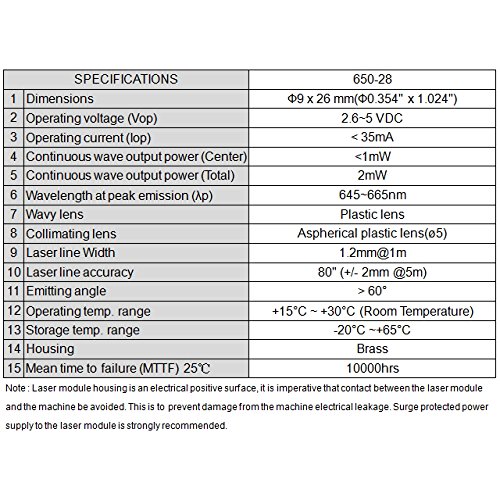 Wave length: 650nm. Output power (Center) : Class II - less than 1mW. 2.6~5 VDC operation. Dimensions: D9 x 26 mm.