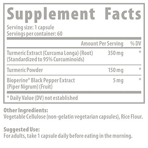 TURMERIC BENEFITS – Promising studies have shown Turmeric as a natural anti inflammatory supplement may fight joint pain, back pain, hand pain and knee pain. As an antioxidant supplement it may support your heart health and liver, detox your body, lower cholesterol and more. Our Curcumin supplements pack an effective 350mg of 95% standardized curcumin extract per capsule.