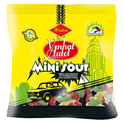 -. Feature : Halva Vanhat Autot Mini Sour / Salty and fruity cars for any day of the week (apple, wild strawberry, guarana-salmiak, rhubarb-strawberry and apple-lemon lime) / Soft and Chewy / Package includes 2 individual 3,88 oz bags / Made in Finland