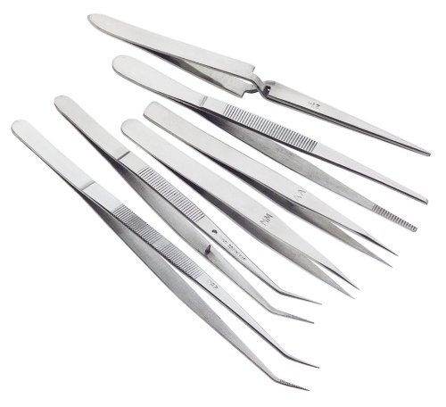 This 6-piece set of stainless steel tweezers includes every shape and size needed for the workshop. A great set to have handy.