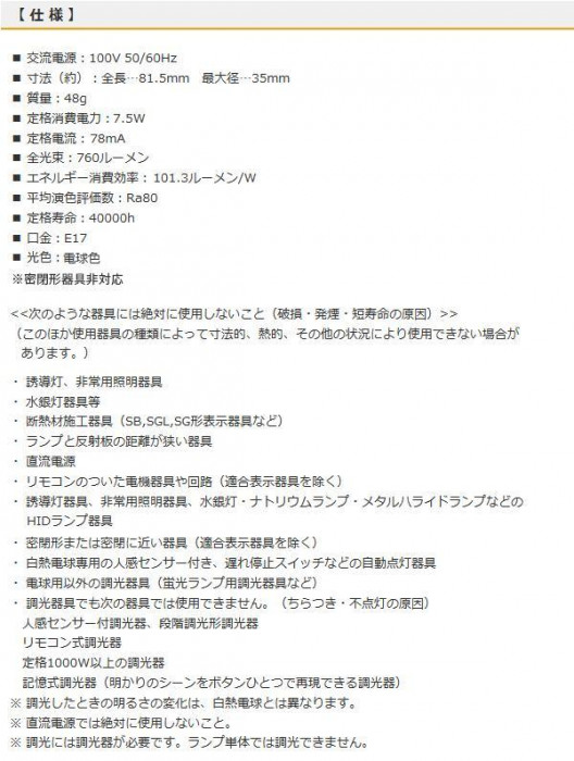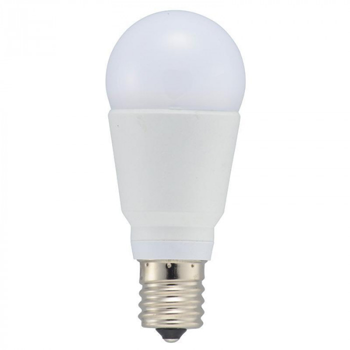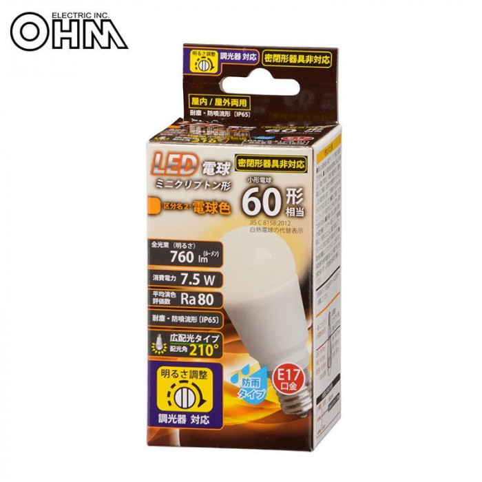 小形電球60形相当の明るさ。調光器対応、屋内/屋外両用のLED電球です。光色は電球色です。