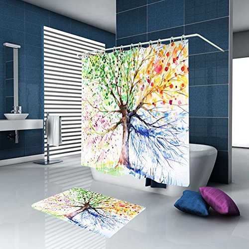 Colorful Tree Art Print Four Seasons Bathroom Sets Polyester Fabric Shower Curtain with Mat Rug -12 Rings