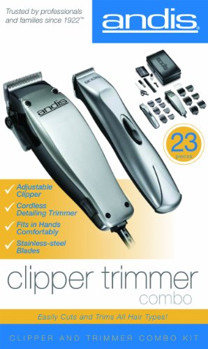 The Andis Clipper/Trimmer Combo 23-Piece Haircutting Kit cuts all hair types and lengths and is perfect for all-around hair cutting and trimming around the ears, sideburns, and facial hair. This 23-Piece Haircutting Kit features easy-to-use numbered guide combs, which enable a professional looking cut, high-quality stainless-steel blades for long cutting life, and a 5-year warranty. Ensure the longevity of your blade's life by oiling it before every use.Feature