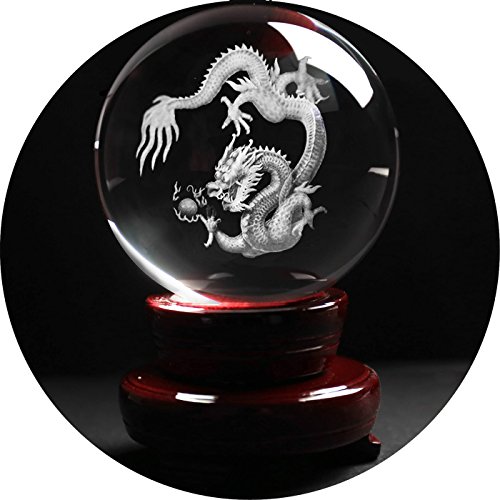Crystal Ball with wood stand,debous 80mm 3 inch High Clear Quartz Crystal Ball with a 3D Inner Carving Dragon inside