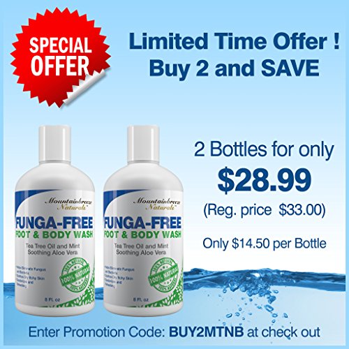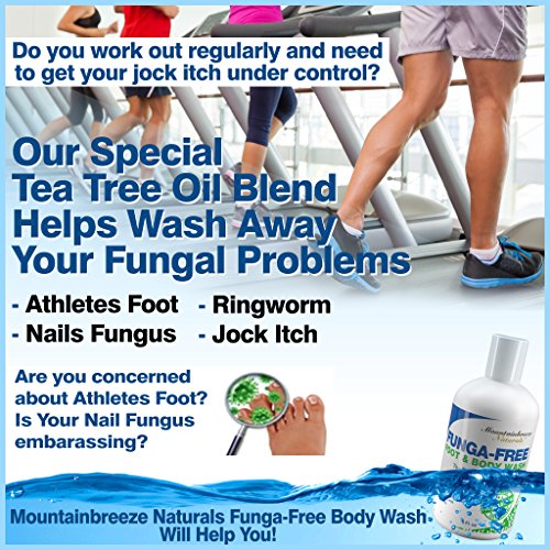 - Feature : SPECIAL DISCOUNT OFFER: Buy 2 and Save! Now Only $ 28.99 instead of 33.00. Enter Discount Code BUY2MTNB upon Check Out. Limited Time Offer. Combat Fungus without Drying Out your Skin! With regular use you can wash away your fungal problems and prevent fungus from coming back! / NO NEED TO WORRY ABOUT CATCHING A FUNGAL INFECTION- A Must for Active People Who Run, Cycle, Play Team Sports or Work-Out Regularly at the Gym. Throw a bottle of our Funga-Free body wash into your gym bag and use regularly. You will see and feel the difference. Anyone can get fungal infections which is irritating and often embarrassing, so take action today to help fight against it. / GETS RID OF FUNGUS & BACTERIA- Our Special Tea Tree Oil blend fights against stubborn fungus and bacteria and help you with fungal and bacterial infections such as Athletes Foot, Nail Fungus, Ringworm, Yeast Infections,Jock Itch and Rashes. Also Deodorizes and Refreshes Smelly Feet and Body Odors. Relieves Itchy, dry flaky skin with the help of Aloe Vera and our organic blend of Coconut, Olive and Jojoba Oils. Each has its own healing properties that will moisturize and soothe your skin. / FUNGUS SOAP & FOOT WASH: NO MORE ITCHY SMELLY FEET- Our Formula has NO CHEMICALS only Natural Ingredients and is free of synthetic chemicals, artificial colors, fragrances, preservatives, alcohol and detergents and is made in the U.S.A. Enriched with Organic Oils that can help your skin heal and feel wonderful! ACNE BODY WASH: Acne sufferers love using a natural cleanser for their problem areas. Great for use on acne on the back or chest since it washes away bacteria and helps heal without drying out your skin. / ABSOLUTELY NO RISK- 45 Day Money Back Guarantee. We want to offer you the best product and best customer service. We strive to make it right for our valued customers. Start combating your fungal issues and give Mountainbreeze Naturals "Funga-Free" a try!