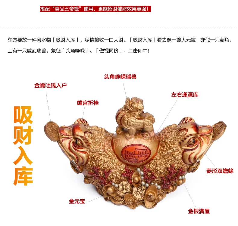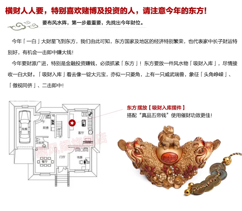 1、 东方:摆放【吸财入库】,首先催旺[一白财星],金蟾瑞兽吸财入库!