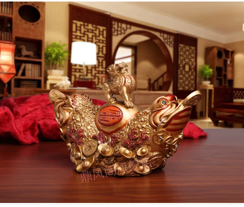 蟾蜍口中咬着金钱,此造型是源自民间故事「刘海戏金蟾」,刘海点化贪财的金蟾每走一步吐金钱,周济老百姓。蟾蜍亦代表蟾宫,广寒宫是神仙月殿,蟾宫折桂代表高中科举。在家中放金蟾,寓意极吉祥。